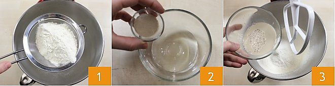 Para realizar las tostadas tomad el bol de una batidora planetaria equipada con pala, tamizad las harinas 1, disolved la levadura en agua tibia (alternativamente podéis utilizar 15 g de levadura fresca) 2 y añadidlo a las harinas 3; si no disponéis de batidora planetaria, podéis amasar a mano ayudándoos inicialmente con un tenedor para amalgamar las harinas con los líquidos).