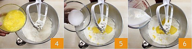 Añadid también los huevos batidos 4, el azúcar 5 y la leche tibia 6. Amasad bien durante aproximadamente 15 minutos, hasta obtener una mezcla homogénea. Si es necesario, detened y volved a girar la masa varias veces.