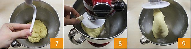 En este punto, reemplazad la pala por el gancho 7 y añadid la sal y la mantequilla blanda, un cubito a la vez 8, esperando que el primero haya sido absorbido antes de añadir el siguiente. Cuando la masa esté lisa y elástica (tardará unos 20 minutos) 9