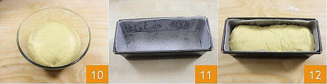 formad una bola 10, colocadla en un bol cubierto con film transparente durante 30 minutos en el horno apagado (la temperatura debe ser de aproximadamente 25°-26°). Transcurrido este tiempo, forrad un molde de plumcake de dimensiones 28 x 11 (h 7 cm) con papel de horno 11, engrasad ligeramente el molde y recortad un rectángulo de 28x11 cm, que cubrirá el fondo del molde, y una tira de 7 cm de alto y 78 cm de largo para las paredes, adherid bien el papel de horno al molde para evitar que se formen pliegues. Retomad la masa, aplastadla con las manos y enrolladla sobre sí misma. Colocadla en el molde 12 dejadla leudar en el horno apagado con la luz encendida