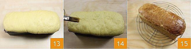 hasta que la masa alcance el borde del molde 13 (tardará aproximadamente 50 minutos). Finalmente, pintad la masa con el huevo batido 14 y horneadla en horno ya caliente a 180° durante 40 minutos. Dejadla templar, desmoldadla y dejadla enfriar sobre una rejilla 15.