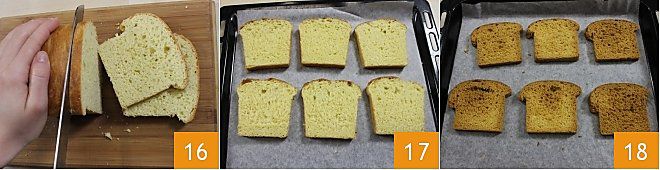Una vez fría, cortad rebanadas 16 de aproximadamente 1/2 cm (o 1 cm, según los gustos), colocadlas en una bandeja de horno cubierta con papel de horno 17 y hornead en horno estático ya caliente a 150° durante aproximadamente 1 hora, o en horno ventilado a 130° durante 45 minutos o hasta que se hayan secado y alcanzado un color marrón 18. Sacadlas del horno, dejadlas enfriar sobre una rejilla. ¡Vuestras tostadas están listas para ser disfrutadas con las confituras que prefiráis!