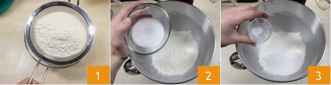 Para preparar las trenzas con masa madre, tamicen primero la harina 1 y luego pónganla en un bol con el azúcar 2, la sal 3,