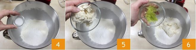 el sobre de vainillina 4, la masa madre 5 y la ralladura de limón 6. El orden de adición de los ingredientes puede variar hasta que empiecen a amasar. Den una mezcla rápida a los ingredientes con las manos o con la pala de una batidora.