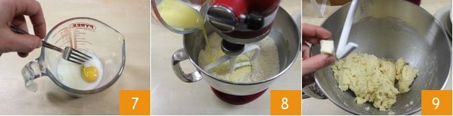 Batan el huevo en la leche con un tenedor 7 y, mientras amasan, viertan todo en la mezcla en el bol 8, incorporando bien todos los ingredientes. Cuando la mezcla esté homogénea, si usan la batidora, cambien la pala por el gancho (o continúen amasando a mano) e incorporen la mantequilla, suavizada a temperatura ambiente, un trozo a la vez 9, asegurándose de no añadir más mantequilla hasta que la anterior haya sido absorbida.
