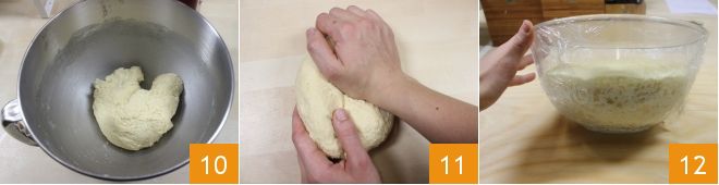 Deben obtener una masa lisa y suave 10: trasládenla a una superficie enharinada para trabajarla un poco más con las manos 11 y luego pónganla en un bol cubierto con un film transparente y déjenla fermentar en el horno apagado con solo la luz encendida durante aproximadamente 16 horas. Pasado el tiempo necesario, su masa habrá duplicado su volumen y presentará una bonita alveolatura 12.