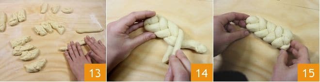 Dividan la masa en 5 (o 6) partes iguales, luego dividan aún más las partes en tres piezas 13, que modelarán en forma de bastón y trenzarán 14. Fijen bien el extremo de cada trenza 15, que será de aproximadamente 10 cm de largo. Alternativamente, también pueden formar una trenza única más grande, dividiendo la masa en tres partes.