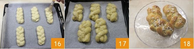 Coloquen las trenzas en una bandeja de horno, forrada con papel de horno y pincélenlas con una yema batida en dos o tres cucharadas de nata o leche 16, Decórenlas con el azúcar en grano y déjenlas fermentar durante otras 2 horas, en el horno apagado con la luz encendida, hasta que hayan duplicado su volumen 17. Horneen las trenzas en un horno ya caliente y estático a 180° durante unos 25-30 minutos y sáquenlas cuando estén bien doradas en la superficie 18! Sus trenzas con masa madre están listas: ¡verán qué buenas!