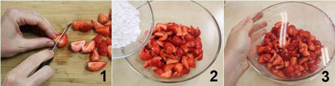 Para preparar el trifle, cortad las fresas en gajos regulares 1 y ponedlas en un bol grande a macerar con el azúcar glas 2, luego cubrid con film y meted todo en el frigorífico durante una noche 3: el azúcar deberá disolverse completamente y formar un jarabe con las fresas.