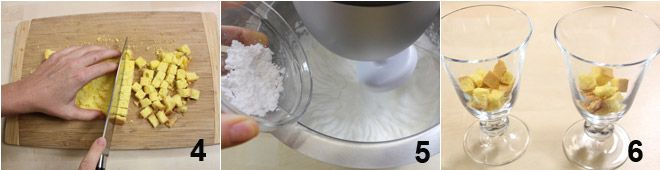 Tomad ahora el bizcocho de soletilla y cortadlo en cubos, de aproximadamente 2 cm de grosor 4 (si queréis preparar el bizcocho de soletilla vosotros mismos, seguid nuestra receta: haced clic aquí), luego ponedlo a un lado y preparad la crema pastelera, con la mitad de la dosis, siguiendo la receta que encontraréis haciendo clic aquí. Montad ahora la nata junto con el azúcar glas 5 hasta obtener una consistencia muy cremosa, luego comenzad a componer el trifle: tomad un vaso grande (en forma de semiesfera o cilindro) y disponed en el fondo los cubos de bizcocho de soletilla 6,