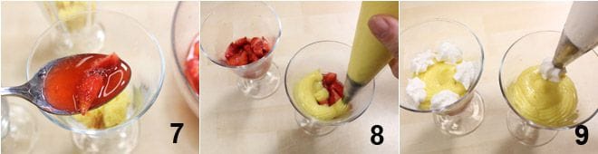 añadid un par de cucharadas de fresas con el jarabe 7, que servirá como almíbar, luego poned, ayudándoos con dos mangas pasteleras, la crema pastelera 8 y la nata montada 9.
