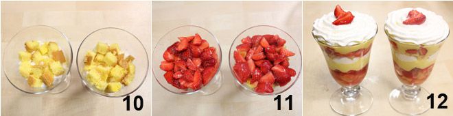Formad ahora una segunda capa disponiendo, como en la primera, cubos de bizcocho de soletilla 10, fresas 11, crema pastelera, nata montada y, para decorar, 2 fresitas cortadas por la mitad 12.