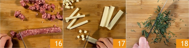 Preparad el resto de los ingredientes: pelad y cortad la salchicha en cubos 16, haced lo mismo con el provolone 17 y finalmente picad el romero 18. Poned a hervir una olla con agua con sal.