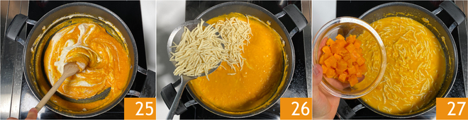 Mezclad bien para combinar el condimento 25, luego escurrid las trofie en la sartén 26 y añadid los cubitos de calabaza reservados 27.