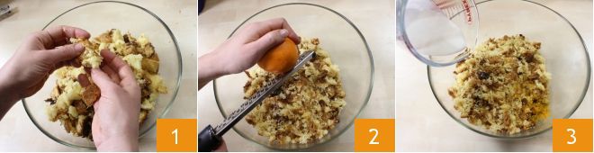 Para preparar las trufas de pandoro al chocolate, desmenuza el pandoro con las manos 1, añade la cáscara rallada de una naranja no tratada 2 y la nata líquida 3.