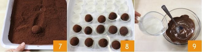 Rueda cada bolita en el cacao amargo 7 y colócalas en pequeños moldes de papel 8. Cuando hayas terminado la masa, prepara la ganache para la cobertura: derrite el chocolate negro al baño maría o en el microondas y vierte la nata que habrás calentado hasta casi hervir 9.