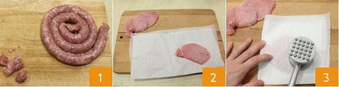 Para realizar los pajaritos escapados, empezad cortando la salchicha en trozos 1, deberíais obtener 16. Golpead las lonchas de carne, para no desgarrarlas, ponedlas sobre una hoja de papel de horno 2, doblarla y luego golpead con el mazo de carne 3 para dejarlas finas.