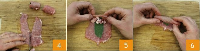 Cortad las lonchas por la mitad 4 (intentad obtener tiras de unos 6-8 cm de ancho), colocando en cada tira obtenida una hoja de salvia y 3-4 cubitos de panceta 5: enrollad las lonchas de carne para formar un rollo 6 (deberíais obtener 12).