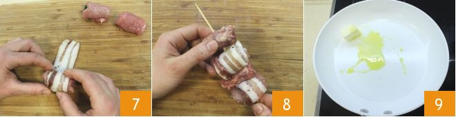 Enrollad en cada rollo una loncha de panceta ahumada 7. Ensartad el rollo obtenido en un palo de brocheta, luego ensartad un trozo de salchicha, otro rollo 8, un trozo de salchicha y terminad con un rollo. Preparad, procediendo de este modo, 8 brochetas. En una sartén bastante amplia, poned a derretir la mantequilla 9