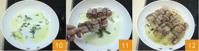 junto con las hojas de salvia y las ramitas de romero 10. Añadid las brochetas 11 y doradlas a fuego lento por ambos lados; cuando estén bien doradas, añadid la pimienta molida y rociadlas con el vino blanco. Cocinad los pajaritos escapados durante unos 20 minutos en total, añadiendo, si es necesario, un poco de agua caliente o caldo hirviendo. Hacia el final de la cocción 12 corregid de sal y servid inmediatamente acompañando los pajaritos escapados con la tradicional polenta humeante o con puré de patatas.
