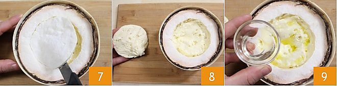 Ahora toma la forma de vacherin, corta con un cuchillo un círculo en la parte superior 7 y levanta la corteza 8. Condimenta el vacherin con el vino blanco 9