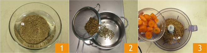 Para preparar el veggie burger, enjuaga bien las lentejas 1, luego escúrrelas y hiérvelas contando aproximadamente 30 minutos desde que el agua empiece a hervir, en agua ligeramente salada 2. Para los tiempos de cocción puedes seguir las indicaciones del paquete. Una vez listas, escúrrelas bien y transfiérelas al bol de la batidora. Añade a las lentejas la zanahoria, recortada, pelada y cortada en trozos 3.