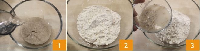 Para preparar las veneziane a la crema, comiencen realizando el prefermento: disuelvan la levadura de cerveza deshidratada (o fresca) en el agua tibia 1. En un bol mezclen la harina 00 y la harina de fuerza 2 y viertan dentro la levadura disuelta 3.