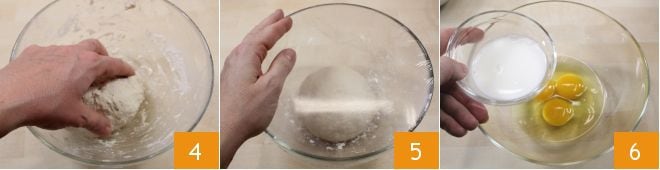Amasen a mano 4 para obtener una masa suave y homogénea 4 que pondrán en un bol cubierto con film 5 y la dejarán fermentar durante unas dos horas a temperatura ambiente. Mientras tanto, preparen lo necesario para la masa principal: pongan los huevos en un bol junto con la leche 6,