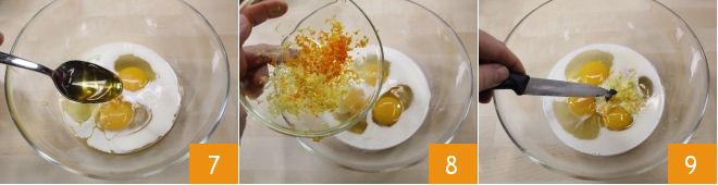 la miel 7, las cáscaras ralladas de naranja y limón 8 y las semillas de una media vaina de vainilla 9. Batan bien todo con un tenedor.