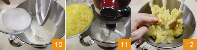 En el recipiente de una batidora (o en un bol grande si amasan a mano), pongan las harinas y el azúcar granulado 10 y, mientras está en acción la pala de la batidora, viertan en hilo la mezcla de huevos 11. La masa deberá estar bien amalgamada y suave 12. Si están usando la batidora, reemplacen la pala por el gancho.