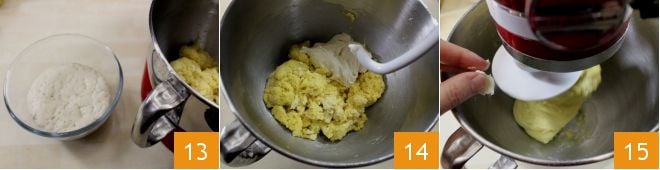En este punto el prefermento habrá duplicado su volumen 13, únanlo a la masa principal en el bol y pongan en marcha la batidora para amalgamar bien los dos compuestos 14. Por último, agreguen la mantequilla ablandada a temperatura ambiente, mezclada con la sal, un trocito a la vez mientras la batidora (velocidad 2) está en acción, sin añadir más hasta que el anterior no esté incorporado 15. Para llegar a una masa lisa, suave y compacta necesitarán unos 25 minutos con la batidora y algunos más si amasan a mano. Una vez añadida toda la mantequilla, para despegar la masa de las paredes de la batidora, pongan algunos pellizcos de harina a lo largo del perímetro del bol hasta que esté enrollada alrededor del gancho. Vierten la masa sobre una superficie de trabajo enharinada y trabajen rápidamente para darle una forma esférica.