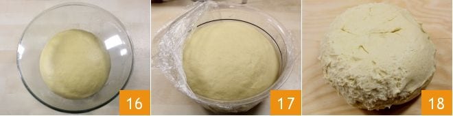Pongan la masa en un bol, cubran con film y déjenla fermentar al menos 2-3 horas 16. Transcurrido este tiempo, transfieran al frigorífico donde descansará por al menos 8 horas y un máximo de 12, duplicando su volumen inicial 17. La masa para las veneziane ahora puede ser modelada: transfieran sobre una superficie de trabajo enharinada 18 y