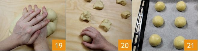 trabájenla con las manos para desinflarla y hacerla más suave 19. Formen un cilindro que dividirán en 12 partes (de unos 80 gr cada una, pero pueden hacerlas también más pequeñas). Trabajen cada pieza para formar bolitas lisas 20 que colocarán en una bandeja de horno forrada con papel pergamino, separadas unas de otras. Pincelen cada bolita con la yema batida con un par de cucharadas de nata o leche y déjenlas fermentar en el horno apagado con la luz encendida hasta que dupliquen su volumen, aproximadamente 2-3 horas.