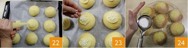 Mientras termina la última fermentación, preparen la crema pastelera (Crema pastelera para la ficha de la receta), calentando la leche con media vaina de vainilla, que una vez caliente, verterán en hilo sobre la mezcla de yemas, azúcar y harina batidos juntos. Llevar todo de nuevo al fuego y, mezclando, hagan espesar la crema que dejarán luego enfriar. Una vez lista, transfieran a una manga pastelera y cubran la superficie de las veneziane con la crema formando espirales, agreguen el granillo de azúcar y hornéenlas en horno estático ya caliente a 180° durante unos 25 minutos, hasta que estén bien doradas. Retiren las veneziane del horno y déjenlas enfriar sobre una rejilla, luego espolvoréenlas con azúcar glas 24: ¡aquí están listas sus veneziane a la crema!