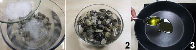 Para preparar las almejas a la marinera, lava las almejas veraces, descartando aquellas con conchas rotas y colócalas en un bol de agua con un puñado de sal gruesa 1 para que suelten la arena. Frota las almejas entre sí con las manos para que eliminen toda la arena posible y déjalas en remojo durante 1-2 horas. Durante este tiempo cambia el agua y la sal gruesa y repite la operación hasta que el agua en el bol esté completamente clara y limpia 2. Para acortar el tiempo, también puedes enjuagar las almejas bajo agua corriente y golpearlas contra una tabla de madera con el lado de la apertura hacia abajo: si la almeja está limpia, puede cocinarse; si sale arena de la almeja, debe descartarse. Coloca en una sartén 4 cucharadas de aceite de oliva virgen extra 3
