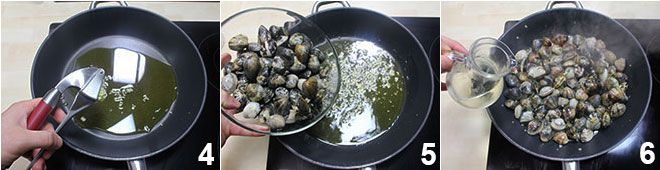 y sofríe los dientes de ajo, pelados y machacados 4. Escurre las almejas y añádelas a la sartén 5, moja con el vino 6 y continúa la cocción, a fuego medio, durante un par de minutos hasta que el vino se haya evaporado completamente.