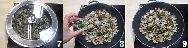 Cubre con la tapa y cocina durante otros 2 minutos 7. Cuando todas las almejas estén bien abiertas, añade una pizca de perejil picado 8, saltéalas un par de veces y ¡tus almejas a la marinera 9 estarán listas para ser servidas!