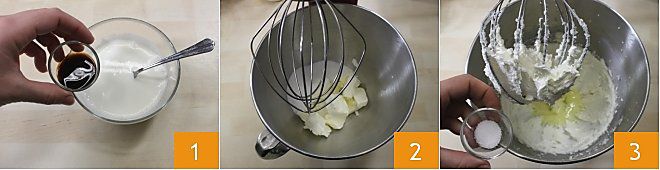 la nata mezclada con la vainilla 4 y mezclad nuevamente para integrar los ingredientes 5. En esta fase, es importante que todos los ingredientes tengan la misma temperatura, de lo contrario, la mantequilla se volverá inmediatamente grumosa. Si esto sucede, no os preocupéis: al añadir la harina, que es un estabilizante, todo se volverá homogéneo. Tamizad juntos, en un bol, la harina, la fécula y la levadura 6.