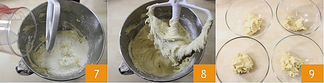 Añadid los ingredientes secos a la mezcla, alternándolos con la leche 7 y continuad mezclando: obtendréis una mezcla muy densa, suave y compacta 8. Dividid la masa en 4 partes iguales 9: una parte quedará blanca, las otras tres se colorearán.