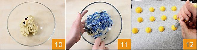 Añadid unas gotas de colorante alimentario en las tres partes de masa que se van a colorear 10: podéis elegir el color que prefiráis, nosotros hemos usado amarillo, rojo y azul. Comenzad añadiendo poco colorante, luego mezclad enérgicamente 11 y si no estáis satisfechos con la coloración, añadid más colorante, hasta obtener el tono deseado. Transferid la mezcla en una manga pastelera con boquilla lisa y, sobre una bandeja cubierta con papel de horno, presionad la masa para formar discos bastante altos, con un diámetro de 2 cm 12.