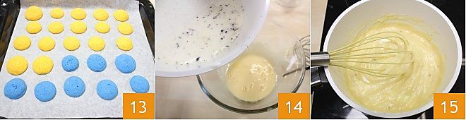 Coced los whoopie en horno estático ya caliente a 180° durante 13-14 minutos (si es ventilado 160° durante 10-12 minutos) 13. Mientras tanto, preparad la crema pastelera según las indicaciones que Crema pastelera: calentad la leche en un cazo con la mitad de una vaina de vainilla y sus semillas; batid en un bol, con la varilla, la yema y el azúcar, luego añadid la harina. Con unas pinzas, eliminad la vaina y verted la leche caliente en la mezcla en hilo 14, integrando con la varilla. Volved a poner la mezcla al fuego y mezclad continuamente hasta que la crema se haya espesado 15. Transferid la crema pastelera a un bol y dejadla enfriar cubriéndola con un film en contacto. Sacad los whoopie del horno y dejadlos enfriar sobre una rejilla.