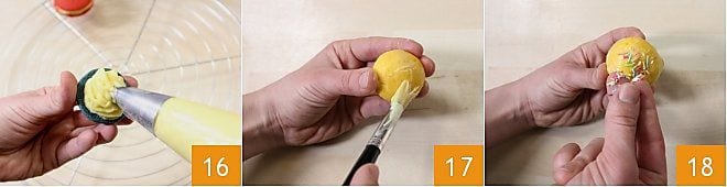 Cuando estén fríos, transferid la crema a una manga pastelera, reservando un par de cucharadas. Componed entonces los whoopie arcoíris: tomad un disco coloreado y rellenadlo con un copo de crema; tomad otro disco, del mismo color o de otro, pincelad la superficie con la crema reservada 17 y colocadlo sobre el disco relleno, presionando ligeramente. Espolvoread la superficie pincelada con crema con los fideos de colores, que se adherirán bien 18. Rellenad de este modo todos los demás whoopie hasta terminarlos: ¡ya están listos vuestros whoopie arcoíris!