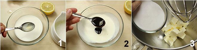 Para preparar los whoopie, empieza por añadir una cucharadita de jugo de limón a la nata fresca líquida 1 (si tienes suero de leche disponible, pasa directamente al paso 2). Añade a la crema obtenida el extracto de vainilla 2 y mezcla. Bate, con las varillas de una batidora (o con una batidora de pie), la mantequilla a temperatura ambiente junto con el azúcar 3 hasta obtener una mezcla clara y espumosa.