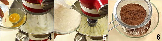 Sin dejar de batir, añade el huevo a temperatura ambiente 4, la sal y la mezcla de nata y limón (o suero de leche) con la vainilla 5. En un bol aparte tamiza la harina y el cacao 6,