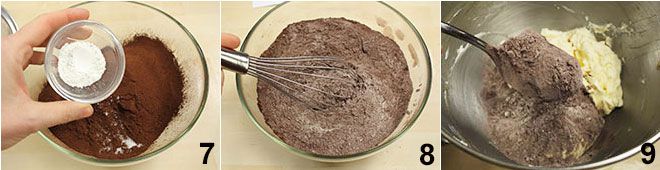 añade la levadura 7 y mezcla todas las harinas con una varilla 8. Incorpóralas ahora a la mezcla de mantequilla, azúcar y huevos con suavidad 9,