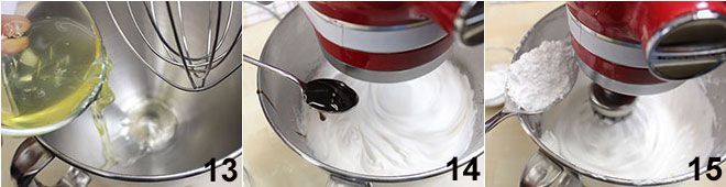 Mientras tanto, prepara la crema de Marshmallows disolviendo en un cazo el azúcar granulado con el agua; cuando el jarabe empiece a hervir, deja que se cocine a fuego medio durante al menos 5 minutos. Mientras tanto, en un bol grande monta las claras de huevo con la pizca de sal 13 y cuando estén montadas a punto de nieve firme y hayan pasado los 5 minutos, añade el jarabe de azúcar caliente en hilo sin dejar de batir con las varillas. Continúa hasta que la mezcla esté tibia. Incorpora entonces la vainilla 14 y el azúcar glas 15.