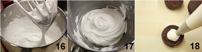 La crema de los whoopie debe resultar densa, lisa y brillante (16-17). Transfiérela a una manga pastelera con boquilla lisa y exprime la crema sobre la parte plana de un pastelito 18 y cubre con la parte plana de otro pastelito. Continúa así hasta terminar los ingredientes.