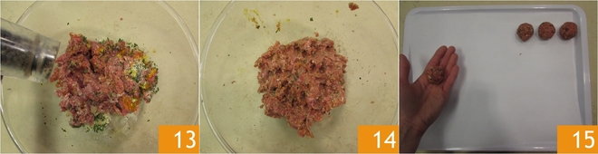 Ajustad de sal y pimienta 13, luego continuad amasando hasta obtener una mezcla homogénea 14. Con la masa obtenida, formad esferas de 20 gramos cada una 15, cogiendo un pedazo de masa y amalgamándolo con ambas manos: con nuestras cantidades deberías obtener 24 albóndigas pequeñas.