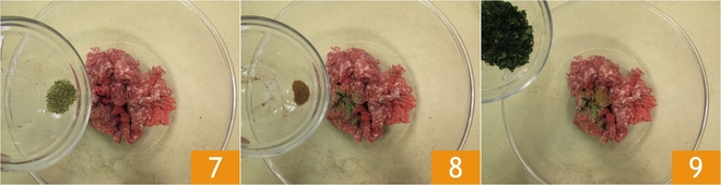 Pon la salchicha y la carne picada en un bol grande 7. Añadid el orégano 7, una pizca de nuez moscada rallada 8 y el perejil picado 9.