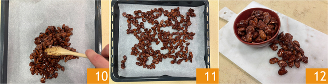 Asegúrate de separarlas lo más posible, ayudándote con la cuchara 10; a medida que se enfríen 10 sepáralas con las manos para evitar que se queden pegadas entre sí y sírvelas en un cuenco 12. ¡Tus almendras garrapiñadas están listas para ser disfrutadas o regaladas!
